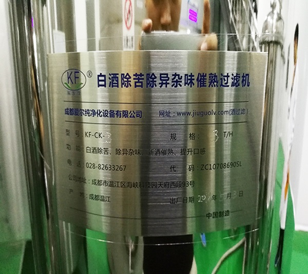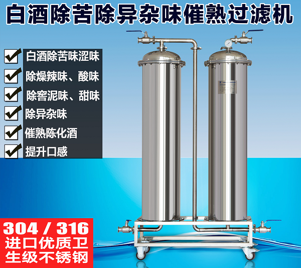 本機采用酒用高分子材料和復合型分子篩相結合的技術, 去除酒中、酒精中的苦味、甜味、澀味、燥辣味、窖泥味、酸味、臭味、異雜味等,經過處理后的酒口感柔和、爽凈、協調,不改原酒風味,過濾后具有催熟陳化功效(新酒催熟效果相當于陳化催熟一年左右)。用戶可根據其酒中異雜味程度不同,可采用單極或雙極除苦除異雜味催熟陳化過濾機。