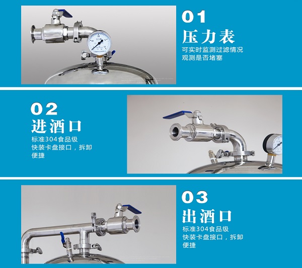 本系列產品采用進口優質衛生級304、316不銹鋼制成,根據不同酒液的特點和過濾速率要求,可配成不同尺寸的一柱、雙柱、及多柱型過濾機。操作簡便、性能穩定、使用壽命長、質量保證。