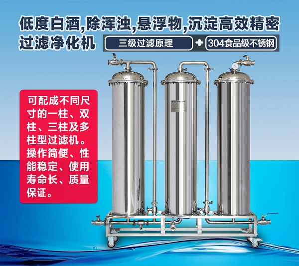 第三級(jí)為超微孔精過濾:對(duì)酒進(jìn)行綜合全面精密過濾,使酒達(dá)到清澈透明。經(jīng)該機(jī)過濾的白酒,清澈透明,口感醇和,不影響酒的主要成分,在零下十五度不渾濁不起懸浮物,處理后可直接灌裝裝瓶。