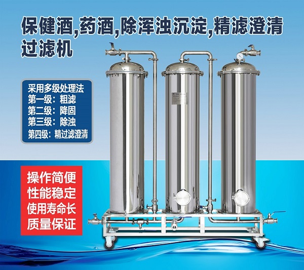 第三級:除濁,除去酒中的焦糖混合物、果膠、難溶結晶體;絮狀沉淀物、第四級:精過濾澄清,使酒保持清澈透明,達到灌裝裝瓶工序。經本機處理后的保健酒、保健飲料不但能保持清澈透明,無沉淀,雜質,還能達到抗凍在零下15度,不渾濁,沉淀,質量指標達到國家標準。