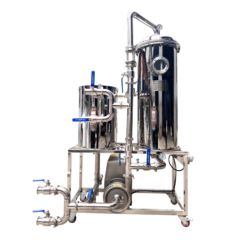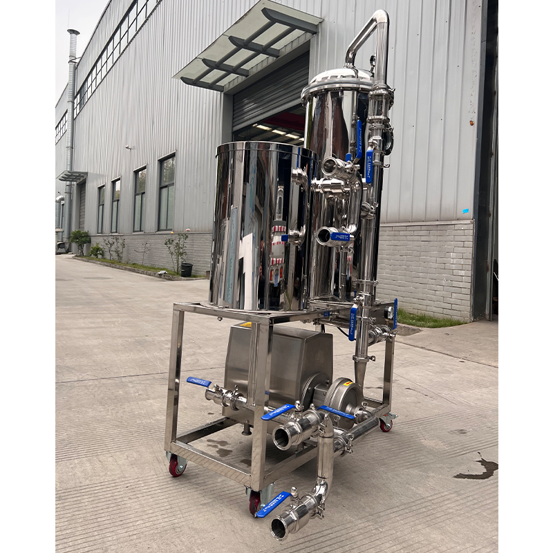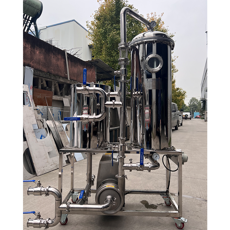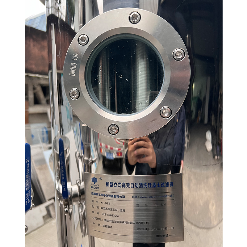 該新型立式高效自動(dòng)清洗硅藻土過濾機(jī),通過設(shè)備自帶預(yù)處理罐,一次加入少量食品級硅藻土助濾劑,及需要過濾的酒液或其他液體攪拌自動(dòng)循環(huán)。將硅藻土助濾劑填充到304不銹鋼濾芯表面,形成精濾預(yù)涂層膜,該精濾膜精度可達(dá)到0.2微米左右,過濾澄清度高,運(yùn)行中硅藻土涂層穩(wěn)固,不會(huì)出現(xiàn)涂層裂紋,漏土等因素影響過濾效率。正常過濾時(shí)精度非常高,過濾后,白酒、保健酒、葡萄酒、果酒、果汁、藥液、澄清透明度達(dá)到100%清澈透明,設(shè)備濾芯不易堵塞,易于反沖清洗。整個(gè)設(shè)備清洗時(shí)間不超過3分鐘,無需拆卸設(shè)備濾芯清洗,直接反沖即可達(dá)到排渣,完成清洗工序。設(shè)備方便維護(hù),設(shè)備因整機(jī)及濾芯全部采用304不銹鋼制成,使用壽命長達(dá)10年以上,還可根據(jù)不同液體特性及粘稠度,調(diào)整更換濾芯精度,可達(dá)到果汁,保健酒,中藥材,脫渣,及精濾澄清功效。